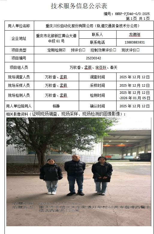 重庆川仪自动化股份有限公司(轨道交通装备技术分公司)定期检测项目公示